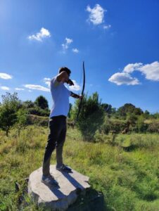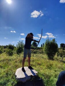 Die Sonne stand hoch am Himmel, als wir im Verein ankamen. Die Hitze war intensiv, aber das konnte unsere Begeisterung nicht trüben. Nach einer kurzen Einführung in die Welt des Bogenschießens, die von der Geschichte des Langbogens bis hin zu den Grundlagen der Schusstechnik reichte, durften wir endlich selbst die Bögen spannen. Der Langbogen, ein Werkzeug, das über Jahrhunderte hinweg für seine Präzision und Einfachheit bekannt ist, stellte auch uns vor eine Herausforderung: Jeder Pfeil verlangte nach Konzentration, Ruhe und sauberer Technik. Jeder kleine Fehler beispielsweise beim Loslassen der Bogensehne bedeutet ein Fehlschuss. Ein guter Schuss erfordert, wie eine gute Analyse, eine Mischung aus Intuition und Technik.